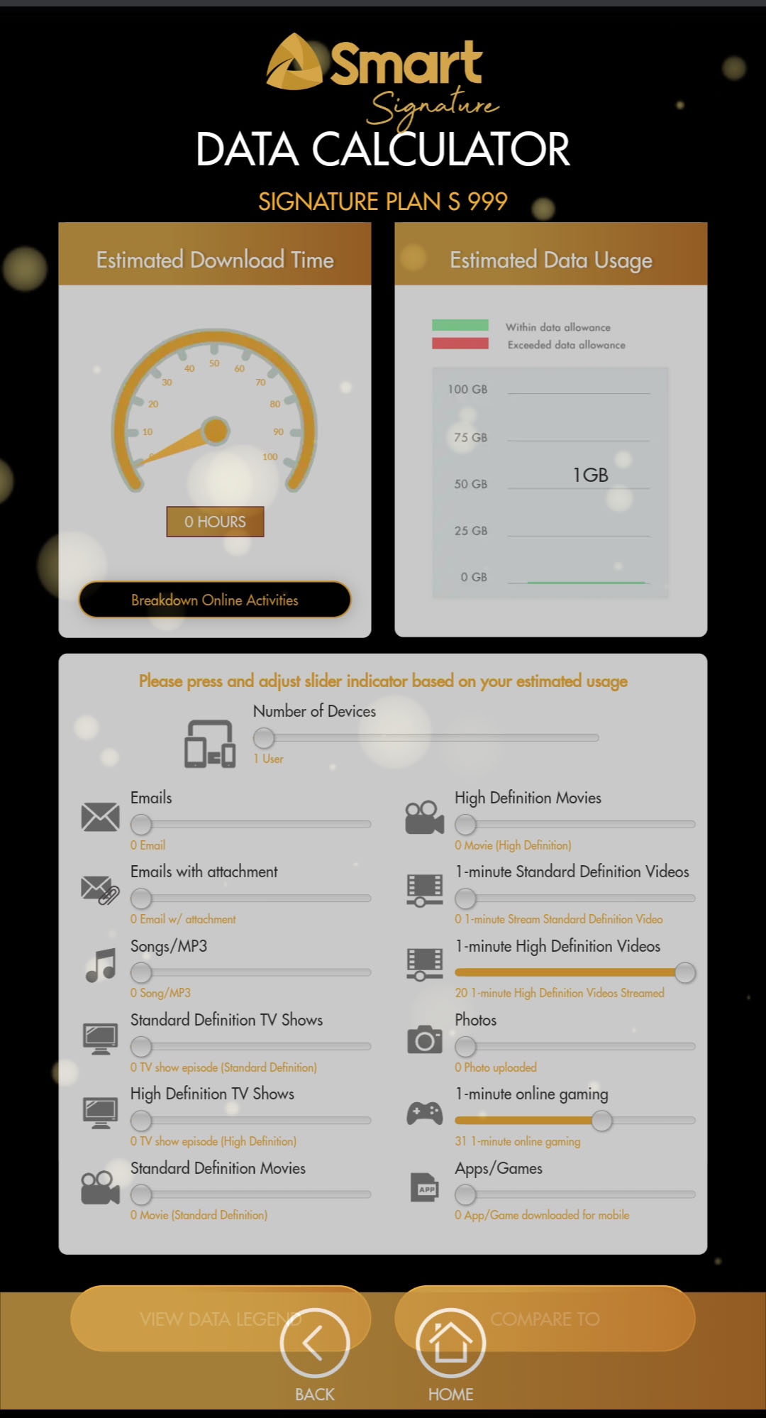 This application will help the customer to calculate their data usage based on their online activities. It will tell you if you exceed the volume allowance of your preferred plan. There's also simulator page here in which the customer can visualize how fast their preferred plan is. It shows the simulation of 'downloading of a 300mb file' and 'streaming of a 1-minute video'. Data analytics is present here.